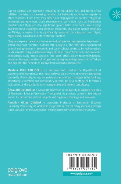 Due to political and economic instability in the Middle East and North Africa (MENA) countries, an increasing number of inhabitants continue to migrate to other countries. From here, they either join employment or become refugee or immigrant entrepreneurs. Such developments carry risks such as integration problems, but there are also significant opportunities. This book takes a deep dive into those challenges and potential prospects, and places special emphasis on Türkiye, a region that is significantly impacted by migration from Syria, Afghanistan, Pakistan and other African countries.