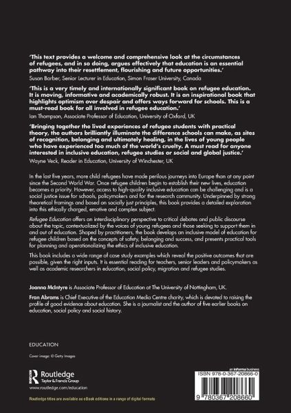 In the last five years, more child refugees have made perilous journeys into Europe than at any point since the Second World War. Once refugee children begin to establish their new lives, education becomes a priority. However, access to high-quality inclusive education can be challenging and is a social justice issue for schools, policymakers and for the research community. Underpinned by strong theoretical framings and based on socially just principles, this book provides a detailed exploration into this ethically charged, emotive and complex subject.