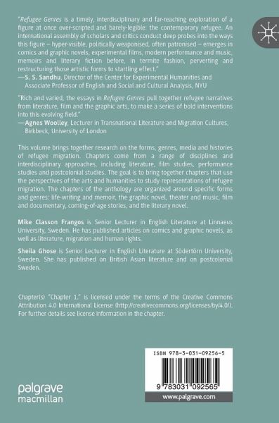 1. Why Refugee Genres? Refugee Representation and Cultural Form.- Part I. Life Writing: Memoir, Comics, Poetry.- 2. "How Do we Survive the Memory of So Much Waiting?": Reconfiguring Empathy in Dina Nayeri's The Ungrateful Refugee.- 3. Family Journeys: Refugee Histories in Vietnamese American Graphic Memoirs.- 4. Insular Metaphors: Representations of Cyprus in Mediterranean Refugee Literatures after the 1980s.- Part II. Performance and Documentary Media.- 5. Home Is Goose Bumps (on a Second Skin): Refugee Experience in the Songs of the Zollhausboys.- 6.Migrant and Radical: Political Migrant Theatre and Activism in Migrations: Harbour Europe.- 7. On the Necropolitics of Contemporary Human Uprootedness: Ecocentric Empathy in Documentary Film and Philosophy.- Part III. The Refugee Novel.- 8. Splitting Apart, Coming Together: Bildung (...shards...) into Mosaic-Being through Performance of the Refugee and Forced-Migration Bildungsroman.- 9. Shattered Forms: Transnational Migration Literatures in Melilla and the Balkan Refugee Route.- 10. "Slowly Into Darkness": Postmemory in Alison Pick's Far to Go and Natasha Solomons' Mr Rosenblum's List.- 11. Responding to Refugee Children: Transfigurations of Genre and Form in Valeria Luiselli's Tell Me How It Ends and Lost Children Archive.- Part IV. Coda.- 12. The Refugee Imaginary.