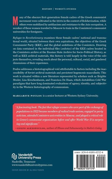 The obscure first-generation female cadres of the Greek communist movement were cultivated in the 1920s in the context of Bolshevization, while others were mobilized by antifascism and resistance to the Axis occupation. A number of these women traveled to Moscow to undertake training in the communist universities for foreigners established by the Comintern. Refugee to Revolutionary examines the national and transnational world the female cadres of the Greek communist movement traversed, situated between their own aspirations, the objectives of the Greek Communist Party (KKE), and the global ambitions of the Comintern. Drawing largely on data contained in the individual files (anketas) of the KKE cadres located in the Comintern archive at the Russian State Archive for Socio-Political History (RGASPI), as well as Greek Communist Party archival materials, this history is told largely in the voice, albeit the "official" voice, of the subjects themselves. These voices reveal much about the personal, cultural, social, and gendered dimensions of their experience. They convey a story of opportunity and sacrifice and the sense of being part of something historic and extraordinary. The overarching purpose of this book is two-pronged: The first is to address a historiographical void attributable to a combination of factors, which includes the inaccessibility of Soviet archival materials and a persistent hegemonic masculinity that continues to define the historiography of Greek communism. Second, this work is situated within a new literature represented by scholars such as Brigitte Studer, Lisa Kirschenbaum, Francisca De Haan, and others, which destabilizes Cold War paradigms that have long dominated evaluations of agency, identity, and subjectivity in the Western historiography of communism.