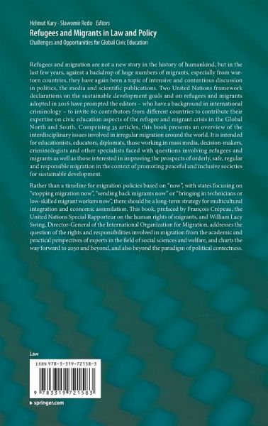 Part I - The Background of the "Refugee Problem": History, Present and Future in the Light of Research - The Role of the Media: Demography, Migration and the European Welfare State by Walter Baar.- Immigration of Refugees into North-West Europe: Austria, Belgium, France, Germany, the Netherlands and the United Kingdom by Rita Haverkamp.- Law and (B)Order: Will Border Fence and Transit Zones Stop the Asylum Seekers Wave on the Balkan Route? by Szilveszter Póczik and Eszter Sárik.- Who Can Claim Protection as a Refugee? A Sociological Critique of the Distinction Between Refugees and Migrants by Albert Scherr.- Refugees and Migrants in the Media: The Black Hole by Thomas Hestermann.- Media Reporting on Refugees and Related Public Opinion in Serbia by Aleksandra Ilic.- Part II - The Two Sides of One Coin: Integration of Refugees/Migrants in Host Countries: Norms, Values and Education: How Different Are Immigrant Youth from Native Youth? Insights from the Third International Self-Report Delinquency Study (ISRD3) by Ineke Haen Marshall and Chris E. Marshall.- Refugee Access to Tertiary Education by Michael Platzer.- On the Importance of Preschool Civic Education for the Global Culture of Lawfulness by Slawomir Redo.- "Living with and Learning from Refugees". Schools in Vienna Dealing with Global Challenges by Andrea Lehner-Hartmann and Viera Pirker.- Teaching about Migrants and Refugees of West African Countries: UNESCO's Experience and Recommendations for Educationists and Educators by Akemi Yonemura.- Democracy or Sharia? Political Attitudes among Refugees in Berlin in Summer 2016 by Ronald Freytag, Justin Reichelt and Vaishnavi Upadrasta.- Migration in Germany. An International Comparison - On the Psychotraumatic Stress among Refugees by Helmut Kury, John P.J. Dussich and Maximilian Wertz.- Psychological and Organizational Aspects of Migration of a Special Group of Refugees - The Example of the Special Quota Project Baden-Württemberg with Yazidi Women and Children in Freiburg by Jennifer Hillebrecht, Tina Zeiss and Jürgen Bengel.- Labour Market Access and Labour Opportunities for Refugees. Examples from Freiburg by Jasmin Ateia, Philip Bona and Stephan Schmieglitz.- A Culture of Welcome - Challenges and Experiences in the City of Freiburg/Germany by Hans Steiner and Antje Reinhard.- Wounded and Uprooted: Seeking Refuge in the Land of Others by Steve S. Olweean.- Generalized Trust and Attitudes towards Refugees in Portugal and Spain by Alfonso Serrano-Maillo.- Part III - Meeting the Challenges for a Global Civic Education: Country Studies with Practical Experiences: Refugees in the United States of America from a Victimological Perspective by John P.J. Dussich.- It's Just Europe's Turn: EU's and Greece's Response to the Current Refugee and Migration Flows by Anastasia Chalkia and Anastasios Giouzepas.- Refugees and Asylum Seekers in Central-European Countries - Reality, Politics and the Creation of Fear in Societies by Witold Klaus, Miklós Lévay, Irena Rzeplinska and Miroslav Scheinost.- Migration Issues in Slovenia: Beyond the Rhetoric of University-level Criminology and Crime Prevention Education for Sustainable Development by Gorazd Mesko, Rok Hacin, Urska Pirnat and Katja Eman.- Crossing the Boundary: Refugees and (Illegal) Migrants in India - Challenge of Integration by Swati Shirwadkar.- Regional Governance of Migration in the Southern African Development Community: Migration Regimes and their Implications for the Experience of Refugees and Migrants in South Africa by Tilmann Feltes, Saul Musker and Philine Scholz.- Fear of Crime and Terrorism among Israeli and Swedish Citizens by Mally Shechory-Bitton and Esther Shachaf Friedman.- Part IV - Refugees and Social/Criminal Behaviour: More Refugees, More Offenders, More Crime? Critical Comments with Data from Germany by Thomas Feltes, Katrin List and Maximilian Bertamini.- Risk Factors for Violence against Refugee Women by Janet P. Stamatel and Chenghui Zhang.- Refugees and Migrants in German Prisons - Outlining Problems and Solutions by Bernadette Schaffer and Joachim Obergfell-Fuchs.- Part V - Next Steps: Who is a Refugee in the European Union? International and Supranational Aspects of Legal Reform and Integration by Rita Haverkamp.- United Nations "Earth Jurisprudence", its Golden Rule, the "Refugee Problem" and Urban Safety by Slawomir Redo.- Addressing the Plight of Immigrants and Refugees: The Role of UNIDO by Jebamalai Vinanchiarachi and Inez Wijngaarde.- Conflict Management for Refugee Management by Michael Reiss.- Volunteers and Community Service Members in Support of Refugee Relief Programmes by Wolfgang Roth.- Migration in the Light of Criminology and Psychology: "Win-win" in Theory and Practice by Magdalena Ickiewicz-Sawicka and Aleksandra Borkowska.- Citizens of "Homeland Earth". UNESCO on the Road to "Global Citizenship Education": The Refugee Example by Werner Wintersteiner.