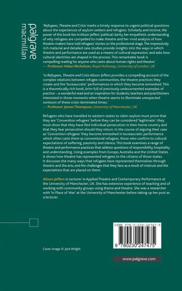 'Refugees, Theatre and Crisismarks a timely response to urgent political questions about the experiences of asylum seekers and refugees. Scholarly and incisive, the power of this book lies is in Alison Jeffers political clarity, her empathetic understanding of why refugees are compelled to make theatre and her vivid analysis of how theatre-makers have told refugees' stories on the professional stage. The impressively rich material and detailed case studies provide insights into the ways in which theatre and performance are used as a means of cultural expression, and asks how cultural identities are shaped in the process. This remarkable book is compelling reading for anyone who cares about human rights and theatre.' - Professor Helen Nicholson, Royal Holloway, University of London, UK