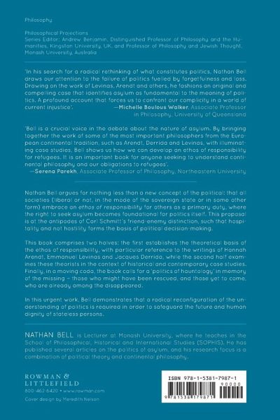There have never been more refugees, across the world from Myanmar to Syria, than at this moment. Many more millions of refugees are likely to be displaced by the effects of climate change. Why has politics failed to produce adequate responses to these challenges, and not heeded the lessons of refugee crises of the past? Are human rights and international law, or more radically, the case for 'open borders', sufficient to address them? Nathan Bell argues for nothing less than a new concept of the political: that societies (liberal or not, in the mode of the sovereign state or some other form) embrace an ethos of responsibility for others, where the right to seek asylum becomes foundational for politics itself. Such a proposal is at the antipodes of Schmitt's friend-enemy distinction, such that hospitality and not hostility forms the basis of political decision-making. This book comprises two halves: the first establishes the theoretical basis of the ethos of responsibility, with particular reference to the writings of Hannah Arendt, Emmanuel Levinas and Jacques Derrida, while the second half examines these theorists in the context of historical and contemporary case studies. Finally, the book calls for a 'politics of hauntology' in memory of the missing - those who might have been rescued, and those yet to come, who are already among the disappeared. In this urgent work, Bell demonstrates that a radical reconfiguration of the understanding of politics is required in order to safeguard the future and human dignity of stateless persons.