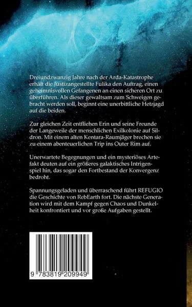 Dreiundzwanzig Jahre nach der Arda-Katastrophe erhält die Justizangestellte Fulika den Auftrag, einen geheimnisvollen Gefangenen an einen sicheren Ort zu überführen. Als dieser gewaltsam zum Schweigen gebracht werden soll, beginnt eine unerbittliche Hetz- jagd auf die beiden. Zur gleichen Zeit entfliehen Erin und seine Freunde der Langeweile der menschlichen Exilkolonie auf Sil- dron. Mit einem alten Kentara-Raumjäger brechen sie zu einem abenteuerlichen Trip ins Outer Rim auf. Unerwartete Begegnungen und ein mysteriöses Arte- fakt deuten auf ein größeres galaktisches Intrigen- spiel hin, das sogar den Fortbestand der Konvergenz bedroht. Spannungsgeladen und überraschend führt REFUGIO die Geschichte von REBEARTH fort. Die nächste Ge- neration wird mit dem Kampf gegen Chaos und Dun- kelheit konfrontiert und vor große Aufgaben gestellt.