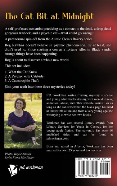 By USA Today bestselling author P.D. Workman A self-professed con artist practicing as a contact to the dead, a drop dead gorgeous warlock , and a psychic cat - what could go wrong? Give yourself a treat and buy the first three books in the Reg Rawlins, Psychic Detective series for one low price. This set includes: 1. What the Cat Knew The fortune teller gig started as a scam, but Reg suddenly finds herself tangled up in the case of Warren Blake, a man who she thought was dead. It turns out he may still be alive, but in mortal peril. 2. A Psychic with Catitude Reg Rawlins is back in business, asked by Detective Jessup to consult on a missing persons case. Little does she know that it's not your average teen runaway or kidnapping. There is something strange going on, and time is running short for the missing teen. 3. A Catastrophic Theft Reg's relationship with Sarah, who has been her loyal friend and protector since she arrived becomes strained when Sarah's precious emerald necklace disappears. There is no shortage of suspects, with Reg herself at the front of the line. Get your paws on it now!