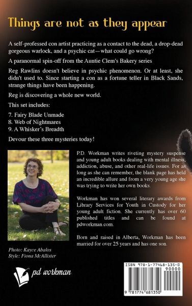 By USA Today bestselling author P.D. Workman A self-professed con artist practicing as a contact to the dead, a drop dead gorgeous warlock , and a psychic cat - what could go wrong? Give yourself a treat and buy these three books in the Reg Rawlins, Psychic Detective series for one low price. This set includes: 7. Fairy Blade Unmade Reg definitely doesn't need to be dealing with a magically-injured fairy, an expedition to the Blue Ridge Mountains, or getting the cooperation of yet another magical species. 8. Web of Nightmares Reg senses that all is not well in Black Sands. She is plagued by nightmares and visions, but her ability to consciously access her powers is limited and she is going to need them to save her friends. 9. A Whisker's Breadth Reg has acquired a client with terrible luck. Reg needs all of the psychic powers that she and Starlight possess to see Vivian King's future and what catastrophic accidents stand in her way.Get your paws on it now!