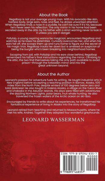 Regalbop is anything but ordinary. With avocado-green skin, a hairless body , and oversized ears, nose, and feet, he stands out in ways he never wanted. When he discovers a mysterious nose in a puddle, he's unsure if it belongs to him-after all, he's never seen his reflection. His father hid the only mirror in their home in the attic, warning him never to look into it unless he was in danger. Enter Pollybip, a young magician-in-training with a knack for trouble. When she witnesses Regalbop losing his extremities, she mistakes it for a magic trick and steals his fallen ears to uncover his secret. But Regalbop's attempt to retrieve them lands him in jail, accused of being the neighborhood burglar. With the police on his trail, a daring escape, and a race against time, Regalbop and Pollybip must confront the mystery of the forbidden mirror. Their only way out? Step through its surface into an uncharted world beyond imagination. A whimsical fantasy adventure filled with magic, mystery, and self-discovery, Regalbop and the Forbidden Mirror is perfect for readers who love quirky characters, unexpected twists, and enchanting journeys into the unknown.