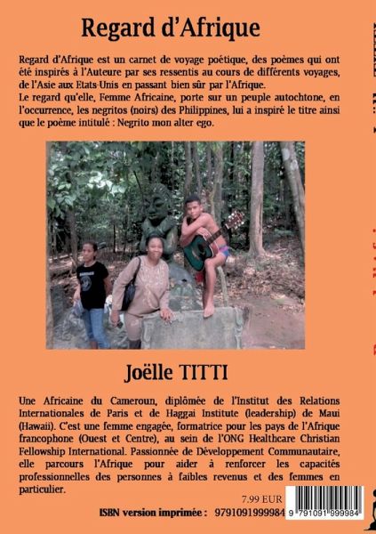 Regard d'Afrique est un carnet de voyage poétique, des poèmes qui ont été inspirés à l'Auteure par ses ressentis au cours de différents voyages, de l'Asie aux Etats-Unis en passant bien sûr par l'Afrique. Le regard qu'elle, Femme Africaine, porte sur un peuple autochtone, en l'occurrence, les negritos (noirs) des Philippines, lui a inspiré le titre ainsi que le poème intitulé : Negrito mon alter ego.