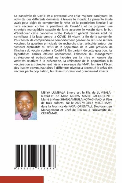 La pandémie de Covid-19 a provoqué une crise majeure paralysant les activités des différents domaines à travers le monde. La présente étude avait pour objet de comprendre le refus de la population kinoise à se faire vacciner contre la pandémie de Covid-19 et de proposer une stratégie managériale capable de faire accepter le vaccin dans le but d'éradiquer cette pandémie virale. L'objectif général déclaré était de contribuer à la lutte contre la COVID 19 visant la fin de la pandémie. Pour tenter de comprendre le comportement général du refus de se faire vacciner, la question principale de recherche s'est articulée autour des facteurs explicatifs du refus de la population de la ville province de Kinshasa du vaccin contre la Covid-19. En partant de cette question, les hypothèses émises étaient notamment, l'absence du management stratégique et opérationnel ne favorise pas la mise en oeuvre des activités relatives à la prévention, la résistance de la population à la vaccination est directement liée à la survenue des MAPI, la mise à l'écart des leaders communautaires à différents niveaux a accentué le refus des vaccins par la population, les réseaux sociaux ont grandement affecte.