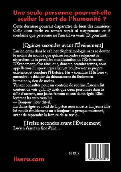 L'ARROGANCE HUMAINE SERA-T-ELLE CHÂTIÉE ?Une seule personne pourrait-elle sceller le sort de l'humanité ?Cette dernière pourrait disparaître de bien des manières. Celle dont parle ce roman serait si surprenante et si soudaine que personne ne l'aurait vu venir. Et pourtant...----[Quinze secondes avant l'Événement]Lucien entra dans le cabinet d'ophtalmologie, sans se douter le moins du monde que quinze secondes seulement le séparaient de la première manifestation de l'Événement.L'Événement, c'est ainsi que, dans un premier temps, nous appellerons l'imprévu qui allait, et bouleverser sa propre existence, et conclure l'Histoire. Par « conclure l'Histoire », entendre : « décider du dénouement de l'existence humaine », rien de moins.Venant consulter pour un contrôle de routine, Lucien fut content de voir qu'il n'y avait que deux personnes dans la salle d'attente, une jeune femme et une dame âgée. Elles levèrent les yeux vers lui.- Bonjour ! leur dit-il.La dame âgée au fond de la pièce resta muette.La jeune fille lui rendit timidement un « bonjour ! » presque murmuré, avant de reprendre la lecture de sa revue.[Treize secondes avant l'Événement.]Lucien s'assit en face d'elle...