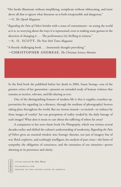 A brilliant, clear-eyed consideration of the visual representation of violence in our culture-its ubiquity, meanings, and effects. Considered one of the greatest critics of her generation, Susan Sontag followed up her monumental On Photography with an extended study of human violence, reflecting on a question first posed by Virginia Woolf in Three Guineas: How in your opinion are we to prevent war? "For a long time some people believed that if the horror could be made vivid enough, most people would finally take in the outrageousness, the insanity of war." One of the distinguishing features of modern life is that it supplies countless opportunities for regarding (at a distance, through the medium of photography) horrors taking place throughout the world. But are viewers inured-or incited-to violence by the depiction of cruelty? Is the viewer's perception of reality eroded by the daily barrage of such images? What does it mean to care about the suffering of others far away? First published more than twenty years after her now-classic book On Photography, which changed how we understand the very condition of being modern, Regarding the Pain of Others challenges our thinking not only about the uses and means of images, but about how war itself is waged (and understood) in our time, the limits of sympathy, and the obligations of conscience.