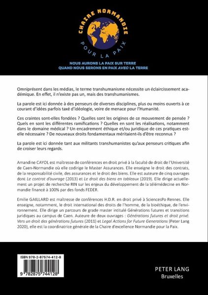 Amandine CAYOL est maîtresse de conférences en droit privé à la faculté de droit de l'Université de Caen-Normandie où elle codirige le Master Assurances. Elle enseigne le droit des contrats, de la responsabilité civile, des assurances et le droit des biens. Elle est auteure de cinq ouvrages dont Le contrat d'ouvrage (2013) et Le droit des biens en tableaux (2019). Elle dirige actuellement un projet de recherche RIN sur les enjeux du développement de la télémédecine en Normandie financé à 100% par des fonds FEDER. Emilie GAILLARD est maîtresse de conférences H.D.R. en droit privé à SciencesPo Rennes. Elle enseigne, notamment, le droit international des droits de l'homme, de la bioéthique, de l'envi- ronnement. Elle dirige un parcours de grade master intitulé Générations futures et transitions juridiques au campus de Caen. Auteure de deux ouvrages : Générations futures et droit privé. Vers un droit des générations futures (2011) et Legal Actions for Future Generations (Peter Lang 2020), elle est la coordinatrice générale de la Chaire d'excellence Normandie pour la Paix.