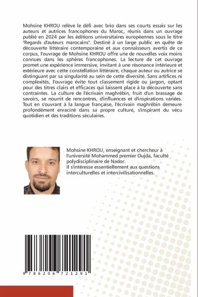 Mohsine KHROU relève le défi avec brio dans ses courts essais sur les auteurs et autrices francophones du Maroc, réunis dans un ouvrage publié en 2024 par les éditions universitaires européennes sous le titre "Regards d'auteurs marocains". Destiné à un large public en quête de découverte littéraire contemporaine et aux connaisseurs avertis de ce corpus, l'ouvrage de Mohsine KHROU offre une de nouvelles voix moins connues dans les sphères francophones. La lecture de cet ouvrage promet une expérience immersive, invitant à une résonance intérieure et extérieure avec cette constellation littéraire, chaque auteur ou autrice se distinguant par sa singularité au sein de cette diversité. Sans artifices ni complexités, l'ouvrage évite tout classement rigide ou jargon, optant pour des titres clairs et efficaces qui laissent place à la découverte sans contraintes. La culture de l'écrivain maghrébin, fruit d'un brassage de savoirs, se nourrit de rencontres, d'influences et d'inspirations variées. Tout en s'ouvrant à la langue française, l'écrivain maghrébin demeure profondément enraciné dans sa propre culture, s'inspirant du vécu quotidien et des traditions séculaires.