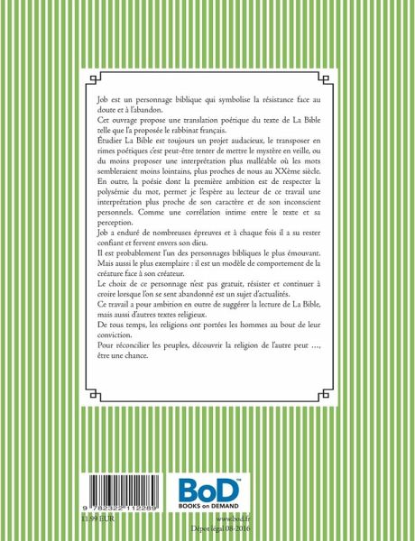 Job est un personnage biblique qui symbolise la résistance face au doute et à l'abandon.Cet ouvrage propose une translation poétique du texte de La Bible telle que l'a proposée le rabbinat français.Étudier La Bible est toujours un projet audacieux, le transposer en rimes poétiques c'est peut-être tenter de mettre le mystère en veille, ou du moins proposer une interprétation plus malléable où les mots sembleraient moins lointains, plus proches de nous au XXème siècle. En outre, la poésie dont la première ambition est de respecter la polysémie du mot, permet je l'espère au lecteur de ce travail une interprétation plus proche de son caractère et de son inconscient personnels. Comme une corrélation intime entre le texte et sa perception.Job a enduré de nombreuses épreuves et à chaque fois il a su rester confiant et fervent envers son dieu.Il est probablement l'un des personnages bibliques le plus émouvant. Mais aussi le plus exemplaire : il est un modèle de comportement de la créature face à son créateur.Le choix de ce personnage n'est pas gratuit, résister et continuer à croire lorsque l'on se sent abandonné est un sujet d'actualités.Ce travail a pour ambition en outre de suggérer la lecture de La Bible, mais aussi d'autres textes religieux.De tous temps, les religions ont portées les hommes au bout de leur conviction.Pour réconcilier les peuples, découvrir la religion de l'autre peut ..., être une chance.