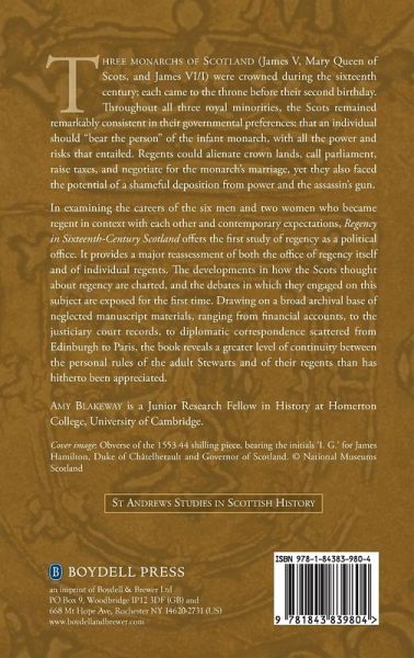Three monarchs of Scotland (James V, Mary Queen of Scots, and James VI/I) were crowned during the sixteenth century; each came to the throne before their second birthday. Throughout all three royal minorities, the Scots remained remarkably consistent in their governmental preferences: that an individual should "bear the person" of the infant monarch, with all the power and risks that entailed. Regents could alienate crown lands, call parliament, raise taxes, and negotiate for the monarch's marriage, yet they also faced the potential of a shameful deposition from power and the assassin's gun. In examining the careers of the six men and two women who became regent in context with each other and contemporary expectations, Regency in Sixteenth-Century Scotland offers the first study of regency as a political office. It provides a major reassessment of both the office of regency itself and of individual regents. The developments in how the Scots thought about regency are charted, and the debates in which they engaged on this subject are exposed for the first time. Drawing on a broad archival base of neglected manuscript materials, ranging from financial accounts, to the justiciary court records, to diplomatic correspondence scattered from Edinburgh to Paris, the book reveals a greater level of continuity between the personal rules of the adult Stewarts and of their regents than has hitherto been appreciated.