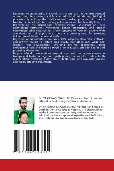 Regenerative endodontics is a revolutionary approach in dentistry focused on restoring the structure and function of dental pulp through biological processes. By utilizing the body's natural healing potential, it offers a transformative solution for treating pulp injuries and tooth vitality loss.Regenerating the dentin-pulp complex involves vascularization, new odontoblast formation, mineralized dentin production, and proper innervation. While research has largely centered on younger patients with abundant stem cell populations, there is a growing need for solutions tailored to adults with non-vital teeth.Regenerative endodontic procedures (REPs) integrate stem cells, scaffolds, and growth factors to restore pulp vitality, strengthen root walls, and support root development. Emerging cell-free approaches, using endogenous cells and dentin-derived growth factors, provide a safer and promising alternative.Despite ethical considerations around stem cell use, advancements in biology and biotechnology are rapidly paving the way for routine tooth regeneration, heralding a new era in dental care with minimally invasive and highly effective treatments.