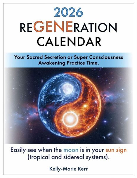 Use this 2026 ReGENEration calendar to easily find your Sacred Secretion or Super Consciousness Awakening practice time. The time of the month when the moon is in your sun sign (zodiac). This period is the optimum time to do your regeneration practises. Super consciousness awakening is known by many other names such as the "Great Regeneration", the "3-fold Enlightenment", the "Kundalini Activation", and the Preservation of the Sacred Secretion. It has to do with Kundalini Energy (Life Force) and Christ Oil or cerebrospinal fluid (CSF). This calendar includes the entire year of 2026, with easy to read pages and inspired note pages also. "There is a perpetual cycle occurring in the temple body. The cycle causes degeneration or regeneration physically, mentally, and spiritually depending on your vibration and choices. The regeneration of the fluidic (lunar) body happens monthly, coinciding with the moon." Once a month, when the moon enters the zodiacal constellation that you were born under and for approximately 3.5 days thereafter, there is an opportunity for super consciousness awakening, involving a flush and reinvigoration of all bodily systems. ~ ~ ~ Other titles by Kelly-Marie Kerr Christmas Magic, The Cosmic Story - An illustrated picture book designed for children. Christmas Alchemy - Harnessing Cosmic Energy - Revealing the true meaning of Christmas as a time for Luni (mas) Solar (Christ) regeneration! The Sacred Secretion, Your Complete Guide to Kundalini Energy, Christ Oil, Alchemy, and the Monthly Seed The God Design, Secrets of the Body, Mind and Soul Elevation, The Divine Power of the Human Body (A Study of the Bible Book of Revelation) The Cell of Life, Awakening and Regenerating - A full disclosure of the 3-Fold Enlightenment revealing the scientific parallel of the "Jesus" seed born in the body every lunar month.
