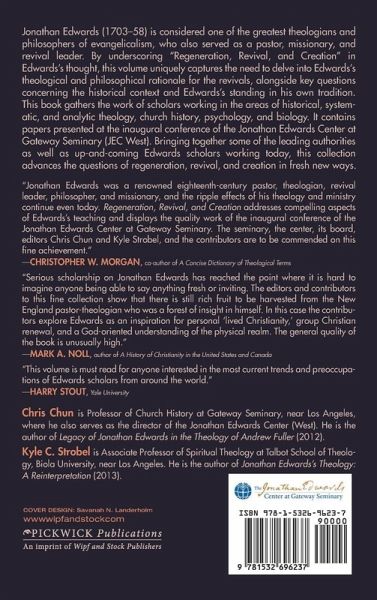 Jonathan Edwards (1703-58) is considered one of the greatest theologians and philosophers of evangelicalism, who also served as a pastor, missionary, and revival leader. By underscoring ""Regeneration, Revival, and Creation"" in Edwards's thought, this volume uniquely captures the need to delve into Edwards's theological and philosophical rationale for the revivals, alongside key questions concerning the historical context and Edwards's standing in his own tradition. This book gathers the work of scholars working in the areas of historical, systematic, and analytic theology, church history, psychology, and biology. It contains papers presented at the inaugural conference of the Jonathan Edwards Center at Gateway Seminary (JEC West). Bringing together some of the leading authorities as well as up-and-coming Edwards scholars working today, this collection advances the questions of regeneration, revival, and creation in fresh new ways. With contributions from: Adriaan Neele, Douglas Sweeney, Chris Woznicki, Obbie Tyler Todd, Peter Jung, Michael Haykin, Ryan J. Martin, Mark Rogers, Allen Yeh, Oliver Crisp, Walter Schultz, John Shouse, Rob Boss, Lisanne Winslow, and Robert Caldwell.