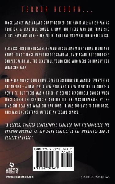 Joyce Lackey was a classic baby-boomer. She had it all: a high-paying position, a beautiful condo, a BMW. But there was one thing she didn't have any more - her youth, and that was what she needed most. Her boss fired her because he wanted someone with "young blood and young ideas." Joyce was forced to start all over again. But could she compete with all the beautiful young kids who were so hungry for what she had? The X-Gen Agency could give Joyce everything she wanted, everything she needed - a new job, a new body and a new identity. In short: a new life, but there was a price. It seemed reasonable enough when Joyce signed the contracts, and besides, she was desperate. By the time she realized what she had done, it was too late to turn back. This was one contract without an escape clause... "A clever, twisted generational thriller that fictionalizes the brewing Boomers vs. Gen X-ers conflict in the workplace and in society at large."