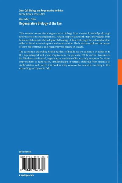 1 Understanding Retina Development Can Inform Future Regenerative Therapies.- 2 Mitochondria in retinal neurodegeneration and stem cell models.- 3 The regenerative potential of the vertebrate retina - lessons from the zebrafish.- 4 Stem Cells and Regeneration in the Xenopus Retina.- 5 Advances in Pluripotent and Adult Stem Cells for Eye Research.- 6 Stem cell strategies for optic nerve protection.- 7 Stem cell strategies for diseases of the outer retina.- 8 Potential of Müller cells and stem/progenitor cells to regenerate retinal tissue.- 9 Stem cells and the ocular lens: implications for cataract research and therapy.- 10 Trabecular Meshwork Stem Cells.- 11 Stem Cells of the Human Corneoscleral Niche.- 12 Advances on optic nerve regeneration and therapeutic strategies.- 13 Bionic Eyes: Vision Restoration through Electronic or Photovoltaic Stimulation.- 14 Stem Cell-Derived RPE Transplantation for Age-Related Macular Degeneration: Experimental Studies to Improve Transplant Survival and Differentiation.- 15 Seeing The Full Picture: The Hidden Cost Of The Stem Cell And Regenerative Medicine Revolution.