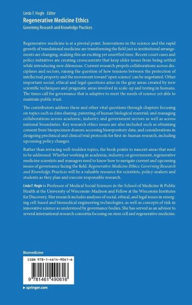 Part I: Foresight, hindsight and peripheral vision: Navigating contemporary legal, ethical and Policy issues in Regenerative Medicine.- Contemporary dilemmas facing regenerative medicine researchers: an overview.- Characterizing International Stem Cell Research Niches.- Policies and practices to enhance multi-sectorial collaborations and commercialization of regenerative medicine.- The Patenting Landscape for Human Embryonic Stem Cells.- Repositories for Sharing Human Data in Stem Cell Research.- PART II: Research Integrity: Updates for Regenerative Medicine Researchers.- Beyond the Checkboxes: Research Integrity for Regenerative Medicine Researchers.- Protecting Human Participants in the Procurement of Materials in Regenerative Medicine Research.- Early-Stage Research: Issues in Design and Ethics.