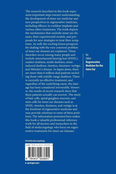 Part I Targets of Regenerative Medicine for the Inner Ear.- 1 Anatomy of the Inner Ear.- 2 Therapeutic Targets and Possible Strategies for Regenerative Medicine for the Inner Ear.- 3 Hair cell.- 4 Stereocilia.- 5 Cochlear Lateral Wall.- 6 Spiral Ganglion Cell and Auditory Neuron.- 7 Synaptic Contacts between Hair Cells and Primary Neurons.- 8 Otolith.- 9 Tectorial membrane.- Part II Development of the Inner Ear.- 10 Development and regeneration.- 11 Otic Induction.- 12 Cochlear Development.- 13 Vestibular Development.- Part III Cochlear Implants.- 14 Cochlear Implant: Past, Present and Future.- 15 Recent Progress in Cochlear Implant.- 16 Regenerative medicine in cochlear implantation.- 17 Artificial cochlear epithelium.- 18 Auditory Brainstem Implant.- Part IV Hair Cell Regeneration.- 19 Hair Cell Regeneration in the Avian.- 20 Self Repair.- 21 Transdifferentiation.- 22 Dedifferentiation-mediated Regeneration.- 23 Gene Therapy.- 24 Cell Therapy.- Part V Spiral Ganglion Neuron Regeneration.- 25 Clinical Background.- 26 SGN development.- 27 Gene Therapy for Regeneration and Preservation of Spinal Ganglion Neurons.- 28 Cell therapy.- 29 Afferent dendrite and axon.- Part VI Stem Cells.- 30 Inner ear stem cells.- 31 Pluripotent Stem Cells.- 32 Somatic Stem Cells.- Part VII Future Perspective.- 33 Regenerative Medicine for the Inner Ear - Summary