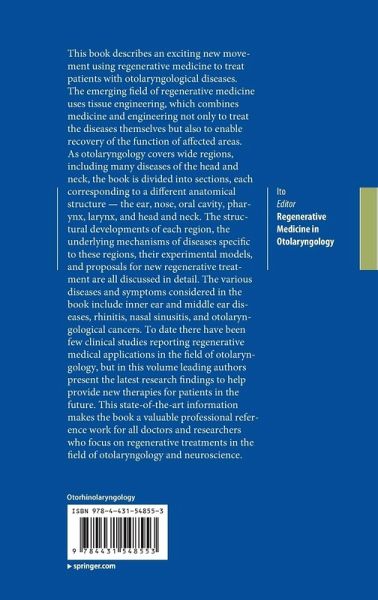 This book describes an exciting new movement using regenerative medicine to treat patients with otolaryngological diseases. The emerging field of regenerative medicine uses tissue engineering, which combines medicine and engineering not only to treat the diseases themselves but also to enable recovery of the function of affected areas. As otolaryngology covers wide regions, including many diseases of the head and neck, the book is divided into sections, each corresponding to a different anatomical structure - the ear, nose, oral cavity, pharynx, larynx and head and neck. The structural developments of each region, the underlying mechanisms of diseases specific to these regions, their experimental models and proposals for new regenerative treatment are all discussed in detail. The various diseases and symptoms considered in the book include inner ear and middle ear diseases, rhinitis, nasal sinusitis and otolaryngological cancers. To date there have been few clinical studies reporting regenerative medical applications in the field of otolaryngology, but in this volume leading authors present the latest research findings to help provide new therapies for patients in the future. This state-of-the-art information makes the book a valuable professional reference work for all doctors and researchers who focus on regenerative treatments in the field of otolaryngology and neuroscience.