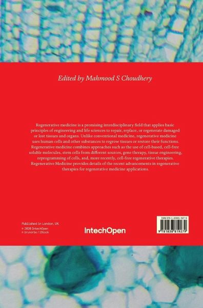 Regenerative medicine is a promising interdisciplinary field that applies basic principles of engineering and life sciences to repair, replace, or regenerate damaged or lost tissues and organs. Unlike conventional medicine, regenerative medicine uses human cells and other substances to regrow tissues or restore their functions. Regenerative medicine combines approaches such as the use of cell-based, cell-free soluble molecules, stem cells from different sources, gene therapy, tissue engineering, reprogramming of cells, and, more recently, cell-free regenerative therapies. Regenerative Medicine provides details of the recent advancements in regenerative therapies for regenerative medicine applications.