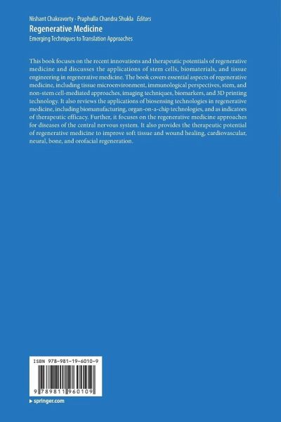 This book focuses on the recent innovations and therapeutic potentials of regenerative medicine and discusses the applications of stem cells, biomaterials, and tissue engineering in regenerative medicine. The book covers essential aspects of regenerative medicine, including tissue microenvironment, immunological perspectives, stem, and non-stem cell-mediated approaches, imaging techniques, biomarkers, and 3D printing technology. It also reviews the applications of biosensing technologies in regenerative medicine, including biomanufacturing, organ-on-a-chip technologies, and as indicators of therapeutic efficacy. Further, it focuses on the regenerative medicine approaches for diseases of the central nervous system. It also provides the therapeutic potential of regenerative medicine to improve soft tissue and wound healing, cardiovascular, neural, bone, and orofacial regeneration.