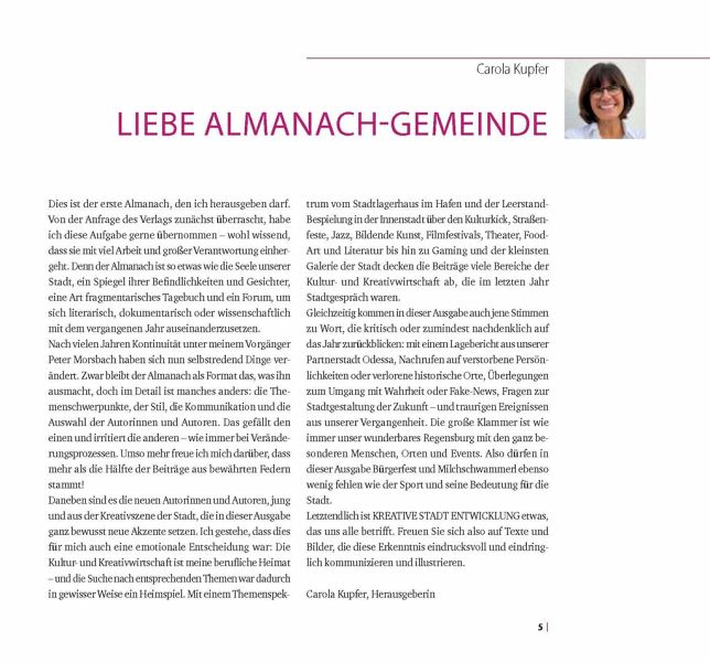 Wenn eine Stadt sich auf den Weg macht, Zukunft zu gestalten, ist sie mit im Spiel: die Kultur- und Kreativwirtschaft. Gemeint sind die vielenkreativen Köpfe zwischen Buch, Bühne, Leinwand, Design, Architektur und Games, die dafür sorgen, dass Orte kulturell vielseitig, jung, spannend, intellektuell, interessant, schön, cool und lebenswert sind - und dabei die Gratwanderung zwischen Bewahren und Neuerfinden meistern. Genau hier schaut der Regensburger Almanach 2023 genauer hin: Was hat sich im letzten Jahr in der Stadtentwicklung getan? Welche Menschen, welche Ideen, welche Themen haben das Stadtbild und die Stadtgesellschaft besonders geprägt? Gibt es historische Vorbilder für moderne Ansätze - und wo geht die Reise hin? Dazu kommen in diesem Almanach auch zahlreiche neue Stimmen zu Wort und erzählen über ihre Perspektive auf eine kreative Stadtentwicklung und das, was Regensburg bewegt.