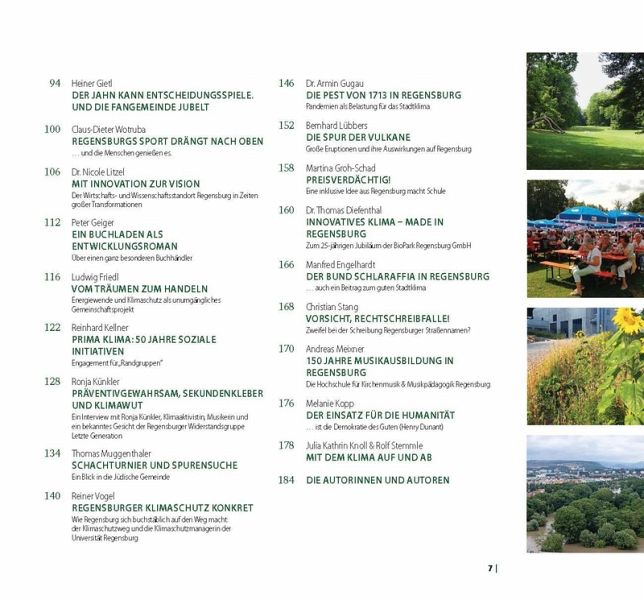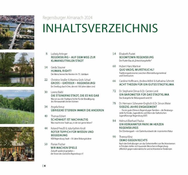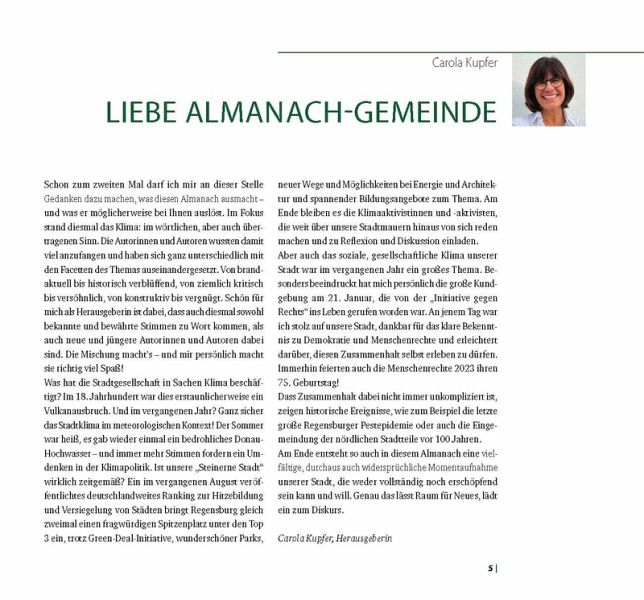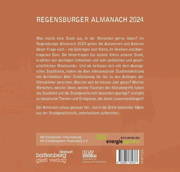 Was macht eine Stadt aus, in der Menschen gerne leben? Im Regensburger Almanach 2024 gehen die Autorinnen und Autoren dieser Frage nach - mit Beiträgen zum Klima, im direkten und übertragenen Sinn.Sie hinterfragen das soziale Klima unserer Stadt, erzählen von wichtigen Initiativen und vom politischen und gesellschaftlichen Miteinander. Und sie befassen sich mit dem ökologischen Stadtklima, indem sie über klimaneutrale Stadtentwicklung von Architektur über Stadtplanung bis hin zu den Anliegen der Klima kleber berichten. Was hat sich im letzten Jahr getan? Welche Menschen, welche Ideen, welche Facetten des Klimabegriffs haben das Stadtbild und die Stadtgesellschaft besonders geprägt? Und gibt es historische Themen und Ereignisse, die damit zusammenhängen?Der Almanach schaut genauer hin - durch die Brille bekannter Köpfe aus der Stadtgesellschaft, unterhaltsam aufbereitet.