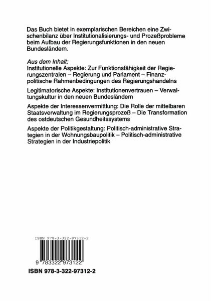 I. Einleitung.- Regierbarkeit in den neuen Bundesländern.- II. Politisch-Institutionelle Aspekte.- Zur Funktionsfähigkeit der Regierungszentralen: Profile der Staatskanzleien.- Regierung und Parlament: Implementationsprobleme des parlamentarischen Regierungssystems in den neuen Bundesländern.- Finanzpolitische Rahmenbedingungen des Regierungshandelns in den neuen Ländern. Das Beispiel des Landes Brandenburg.- III. Politisch-Kulturelle Aspekte.- Verwaltungskultur in den neuen Bundesländern.- IV. Aspekte der Interessenvermittlung.- Die Rolle der mittelbaren Staatsverwaltung im Regierungsprozeß am Beispiel der Inkorporierung von Verbänden.- Die Transformation des ostdeutschen Gesundheitswesens.- V. Aspekte der Politikgestaltung.- Implementationsprobleme kommunaler Politik am Beispiel der Wohnungspolitik in Halle (Sachsen-Anhalt) und Dresden (Sachsen).- Industriepolitik und soziale Restrukturierung in den neuen Bundesländern.