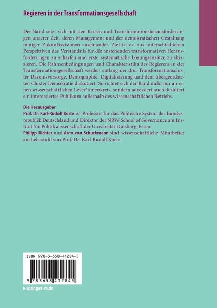 Der Band setzt sich mit den Krisen und Transformationsherausforderungen unserer Zeit, deren Management und der demokratischen Gestaltung mutiger Zukunftsvisionen auseinander. Ziel ist es, aus unterschiedlichen Perspektiven das Verständnis für die anstehenden transformativen Herausforderungen zu schärfen und erste systematische Lösungsansätze zu skizzieren. Die Rahmenbedingungen und Charakteristika des Regierens in der Transformationsgesellschaft werden entlang der drei Transformationscluster Daseinsvorsorge, Demographie, Digitalisierung und dem übergeordneten Cluster Demokratie diskutiert. So richtet sich der Band nicht nur an einen wissenschaftlichen Leser_innenkreis, sondern adressiert auch dezidiert ein interessiertes Publikum außerhalb des wissenschaftlichen Betriebs.