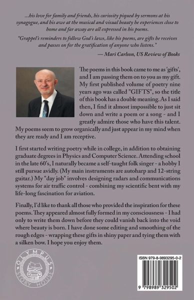 This is my second book of original poetry. The first one, GIFTS, was published nine years ago in 2007. As I said then, I seldom (if ever) sit down to write a poem intentionally. Poems come to me out of the blue - like presents in the mail from far-off friends. I can edit and polish them, rewrapping and refining the original idea, but the real source of the inspiration is always a mysterious gift. Sometimes it comes from interactions with friends and family, other times from my religious or musical families. Sometimes it comes during trips to far-off places, and other times during quiet moments. In this book I pass along these gifts to you. I hope you enjoy them.
