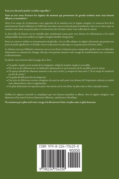 Vous avez du mal à perdre vos kilos superflus ? Vous en avez assez d'essayer les régimes du moment qui promettent de grands résultats mais vous laissent affamés et insatisfaits ? Alors il est temps de révolutionner votre approche de la nutrition avec le régime cétogène. Le nouveau livre de la nutritionniste Sandra Sabbatini est l'allié bien-être dont vous avez besoin pour transformer votre vie et votre corps, en mettant votre santé au premier plan et en disant bye bye à la lutte contre votre reflet dans le miroir. Le best-seller de l'auteur est un véritable plan nutritionnel conçu pour vous donner les informations et les outils indispensables qui sous-tendent un régime cétogène durable à long terme. Entrer en cétose et réduire sa consommation de glucides, c'est en effet adopter un régime alimentaire qui permet une perte de poids significative et durable, tout en respectant son physique et sa passion pour la bonne chère. Le chemin tracé par Sabbatini commence par un test d'auto-évaluation pour comprendre quelles sont vos habitudes alimentaires et comment les changer, afin que vous puissiez entamer votre voyage de transformation avec conscience et détermination. En détail, vous trouverez dans les pages de ce livreUn guide complet sur le monde de la cétogenèse, rédigé de manière simple et accessible. Des tests et des réflexions sur vos habitudes alimentaires et sur la manière de les modifier pour le mieux. Un aperçu détaillé des aliments autorisés et de ceux à éviter (y compris les faux amis !). Il est temps de maintenir un état de cétose ! Un guide détaillé pour lire les étiquettes. Une série de délicieuses recettes cétogènes, du sucré au salé, pour vous donner de l'inspiration culinaire et rendre votre alimentation variée et appétissante. Un plan alimentaire sur sept jours pour vous mettre sur la voie d'une vie plus saine et d'un corps plus mince. Oubliez les régimes restrictifs et compliqués qui vous laissent insatisfait et affamé. Avec le régime cétogène, vous disposerez d'un nouvel univers alimentaire délicieux, satisfaisant et bénéfique. Ne remettez pas à plus tard votre voyage à la découverte d'une vie plus saine et plus heureuse.