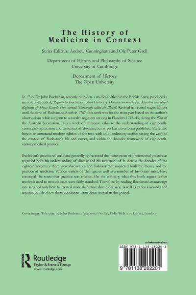 In 1746, Dr John Buchanan, a recently retired medical officer in the British Army, produced a manuscript, 'Regimental Practice, or a Short History of Diseases common to His Majesties own Royal Regiment of Horse Guards when abroad (Commonly called the Blews).' Revised almost until the time of Buchanan's death in 1767, it was primarily based on the author's observations while surgeon to a cavalry regiment serving in Flanders 1742-45 during the War of the Austrian Succession. It is of immense value to the understanding of eighteenth-century interpretation and treatment of diseases, but as yet has never been published. This is an annotated modern edition of the work, set in the context of Buchanan's life and career.