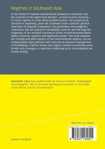 In the context of massive environmental problems in Southeast Asia, the countries in the region have decided - at least in some instances - to create regimes to solve these problems jointly. This empirical observation is surprising, given the Southeast Asian countries' general reluctance to regional cooperation, the governance and budgetary constraints that are typical for developing countries and the huge heterogeneity of the involved countries in terms of environmental vulnerability, economic capacity and hegemonic power. This book analyzes the creation and effectiveness of two environmental regimes, one on transboundary haze pollution and a second on resource management of the Mekong. It will be shown that regime creation is extremely problematic and strategies to overcome conflicting actor constellations are mostly lacking.