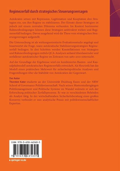 Die Untersuchung ist als wirkungsorientierte Evaluationsstudie angelegt und beantwortet die Frage, wann autokratische Stabilisierungsstrategien Regimezerfall bedingen. In drei Schritten werden Konstellationen von Strategien und Rahmenbedingungen mittels QCA-Analysen anhand überdauernder und zerfallener autokratischer Regime im Zeitraum von 1980-2010 untersucht.