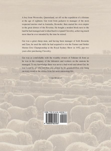 A boy from Wooroolin, Queensland, set off on the expedition of a lifetime at the age of eighteen. Gat went from jackaroo to manager of the most respected merino stud in Australia, Boonoke, then started his own empire in the great district of the Riverina. He bought a modest block next to the land he had managed and worked hard to expand Claverley, achieving much more than he ever intended by the time he retired. Gat was a great sheep man, and having been manager of both Boonoke and Zara, he used the skills he had acquired to win the Farmer and Settler Merino Ewe Championship at the Royal Sydney Show in 1952, just two years after purchasing Claverley. Gat was as comfortable with the wealthy owners of Falkiner & Sons as he was in the company of the labourers and workers on the stations he managed. To my knowledge there was never a bad word said about Gat; he was loved by all who met him and adored by his grandchildren who hung on every word of the stories from his most interesting life.