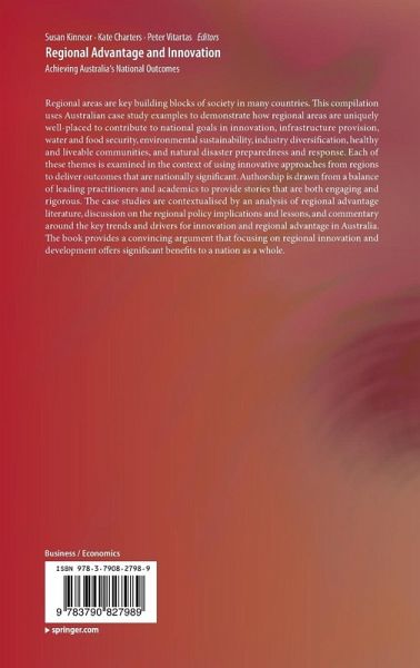 Regional areas are key building blocks of society in many countries. This compilation uses Australian case study examples to demonstrate how regional areas are uniquely well-placed to contribute to national goals in innovation, infrastructure provision, water and food security, environmental sustainability, industry diversification, healthy and liveable communities, and natural disaster preparedness and response. Each of these themes is examined in the context of using innovative approaches from regions to deliver outcomes that are nationally significant. Authorship is drawn from a balance of leading practitioners and academics to provide stories that are both engaging and rigorous. The case studies are contextualised by an analysis of regional advantage literature, discussion on the regional policy implications and lessons, and commentary around the key trends and drivers for innovation and regional advantage in Australia. The book provides a convincing argument that focusing onregional innovation and development offers significant benefits to a nation as a whole.