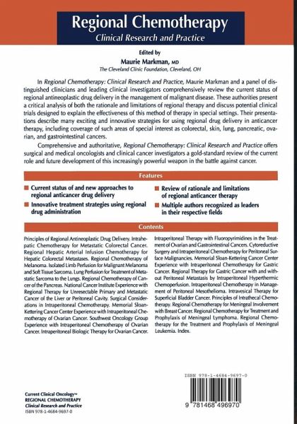 "This book features a relatively thorough discussion of regional chemotherapy in most body cavities, and for most diseases for which there is a current use. Extensive coverage of intraperitoneal chemotherapy for ovarian and gastrointestinal cancers, mesothelioma, is a strength of the text. Likewise, isolated limb and organ perfusion are extensively covered. . . This is a good book with a good purpose. . .it is comprehensive and can be a useful guide in caring for the individual patient or implementing a new approach to treatment in general. Some otherwise hard to find information is presented in this book, which may help in the general dissemination of and use of these therapies. "-Doody's Health Sciences Book Review Journal "The promising and highly innovative approaches to the management of malignant diseases that employ regional drug delivery have been reported during past several years. This book provides an excellent state-of-the-art of this topic....many distinguished contributors-the leading clinicians and clinical investigators discuss in depth all clinical aspects of intrahepatic chemotherapy, isolated limb perfusion, intravesical, intraventricular and intrathccal application of antincoplastic drugs as well as the intracavitary chemotherapy." - Neoplasma "Specific malignant disease settings are exhaustively discussed, and while the local/regional therapeutic approach is advocated throughout, other, more traditional, strategies are also discussed, as is regional drug delivery as part of a multidisciplinary management effort in the most complex tumor forms....The book also includes an important topical chapter on intraperitoneal biological therapies for ovarian cancer, and researchers in this area will appreciate the wealth of recent biological references...The methods and the chemotherapies described, illustrated by a number of useful figures, will provide a good source of reference for oncologists, surgeons, gynaecologists, haematologists and other oncological specialists seeking to enrich their understanding and hone their skills in this rapidly expanding sector."...Retinoids "Rather than encouraging open acceptance of sophisticated, challenging techniques, the authors of each chapter cautiously present pros, cons, and the pitfalls of promising areas in cancer therapy. Few if any individual text books in the field of surgical oncology have focused solely on this developing field of cancer treatment. A surgeon or oncologist interested in an initial review of the subject will be rewarded with a clinical treatise that advances new cancer treating strategies." - Arch Surg