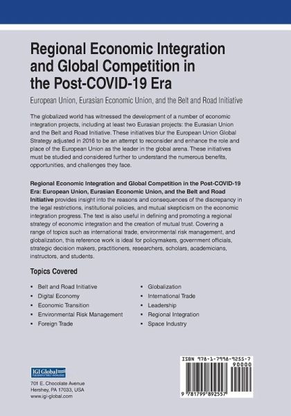 The globalized world has witnessed the development of a number of economic integration projects, including at least two Eurasian projects: the Eurasian Union and the Belt and Road Initiative. These initiatives blur the European Union Global Strategy adjusted in 2016 to be an attempt to reconsider and enhance the role and place of the European Union as the leader in the global arena. These initiatives must be studied and considered further to understand the numerous benefits, opportunities, and challenges they face. Regional Economic Integration and Global Competition in the Post-COVID-19 Era: European Union, Eurasian Economic Union, and the Belt and Road Initiative provides insight into the reasons and consequences of the discrepancy in the legal restrictions, institutional policies, and mutual skepticism on the economic integration progress. The text is also useful in defining and promoting a regional strategy of economic integration and the creation of mutual trust. Covering a range of topics such as international trade, environmental risk management, and globalization, this reference work is ideal for policymakers, government officials, strategic decision makers, practitioners, researchers, scholars, academicians, instructors, and students.