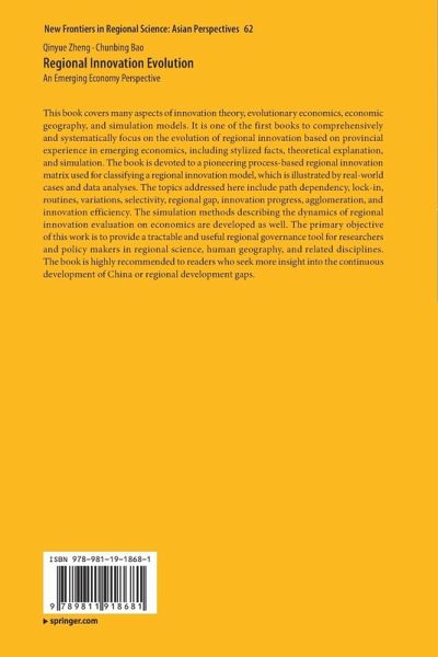 This book covers many aspects of innovation theory, evolutionary economics, economic geography, and simulation models. It is one of the first books to comprehensively and systematically focus on the evolution of regional innovation based on provincial experience in emerging economics, including stylized facts, theoretical explanation, and simulation. The book is devoted to a pioneering process-based regional innovation matrix used for classifying a regional innovation model, which is illustrated by real-world cases and data analyses. The topics addressed here include path dependency, lock-in, routines, variations, selectivity, regional gap, innovation progress, agglomeration, and innovation efficiency. The simulation methods describing the dynamics of regional innovation evaluation on economics are developed as well. The primary objective of this work is to provide a tractable and useful regional governance tool for researchers and policy makers in regional science, human geography,and related disciplines. The book is highly recommended to readers who seek more insight into the continuous development of China or regional development gaps.