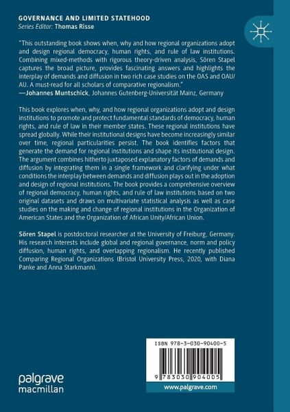 This book explores when, why, and how regional organizations adopt and design institutions to promote and protect fundamental standards of democracy, human rights, and rule of law in their member states. These regional institutions have spread globally. While their institutional designs have become increasingly similar over time, regional particularities persist. The book identifies factors that generate the demand for regional institutions and shape its institutional design. The argument combines hitherto juxtaposed explanatory factors of demands and diffusion by integrating them in a single framework and clarifying under what conditions the interplay between demands and diffusion plays out in the adoption and design of regional institutions. The book provides a comprehensive overview of regional democracy, human rights, and rule of law institutions based on two original datasets and draws on multivariate statistical analysis as well as case studies on the making and change of regional institutions in the Organization of American States and the Organization of African Unity/African Union.