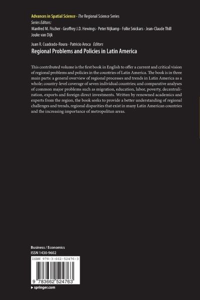 This contributed volume is the first book in English to offer a current and critical vision of regional problems and policies in the countries of Latin America. The book is in three main parts: a general overview of regional processes and trends in Latin America as a whole; country-level coverage of seven individual countries; and comparative analyses of common major problems such as migration, education, labor, poverty, decentralization, exports and foreign direct investments. Written by renowned academics and experts from the region, the book seeks to provide a better understanding of regional challenges and trends, regional disparities that exist in many Latin American countries and the increasing importance of metropolitan areas.