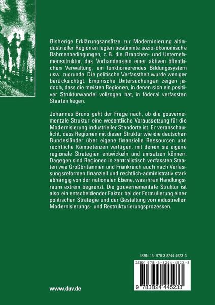 Johannes Bruns geht der Frage nach, ob die gouvernementale Struktur eine wesentliche Voraussetzung für die Modernisierung industrieller Standorte ist. Er veranschaulicht, dass Regionen mit dieser Struktur wie die deutschen Bundesländer, über eigene finanzielle Ressourcen und rechtliche Kompetenzen verfügen, mit denen sie eigene regionale Strategien entwickeln und umsetzen können. Dagegen sind Regionen in zentralistisch verfassten Staaten wie Großbritannien und Frankreich auch nachVerfassungsreformen finanziell und rechtlich-administrativ stark abhängig von der nationalen Ebene, was ihren Handlungsraum extrem begrenzt. Die gouvernementale Struktur ist also ein entscheidender Faktor bei der Formulierung einer politischen Strategie und der Gestaltung von industriellen Modernisierungs- und Restrukturierungsprozessen.