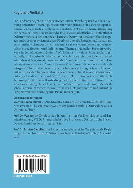 Regionale Vielfalt? Die Entwicklung der Parteiensysteme der Bundesländer im Vergleich mit dem Bund.- Parteiensysteme und Regierungsbildungen in den deutschen Bundesländern von 1946 bis 2023.- Aufstieg und Einfluss der AfD in den deutschen Ländern.- Klein- und Kleinstparteien in den Bundesländern: eine Analyse der institutionellen Rahmenbedingungen und Erfolgsfaktoren.- Populäre und unpopuläre 'Landesfürsten': die Bewertung von Amtsinhabern bei Landtagswahlen.- Parteiensystem, Parteienwettbewerb und Muster der Regierungsbildung in Baden-Württemberg: Von der Dominanz der Christdemokraten zum grünen Musterland?.- Bayern. Der Wandel von einem prädominanten zu einem asymmetrischen Parteiensystem.- Berlin: Großstadtparteien im Stadtstaatparteiensystem.- Das Parteiensystem in Brandenburg: Von der langen Dominanz der SPD hin zum volatilen System ohne Hegemonen.- Parteiensystem im Bundesland Bremen - ein Unikat unter den Bundesländern.- Links-Grüner Pragmatismus mit Bindungskraft: Das Parteiensystem der Freien und Hansestadt Hamburg.- Das hessische Parteiensystem: Von der Polarisierung zwischen CDU und SPD zur gemeinsamen Regierung.- Das Parteiensystem in Mecklenburg-Vorpommern - Die SPD als Leuchtturm in bewegten Zeiten.- Das letzte Parteiensystem der alten Bundesrepublik. Niedersachen als Nachzügler.- Nordrhein-Westfalen.- Das Parteiensystem in Rheinland-Pfalz: Der Dualismus von SPD und CDU prägt den Wettbewerb.- Rote und schwarze Dominanz im saarländischen Parteiensystem.- Das Parteiensystem in Sachsen. Jahrzehntelange CDU Dominanz und die Herausforderung der AfD im Parlament und auf der Straße.- Das Parteiensystem Sachsen-Anhalts: CDU-Dominanz plus Koalitionsvielfalt.- Schleswig-Holstein.- Das Parteiensystem des Freistaats Thüringen: Von der Stabilität zur Dysfunktionalität.- Trends subnationaler Parteiensysteme in Deutschland - eine Zusammenführung von 16 Länderstudien.