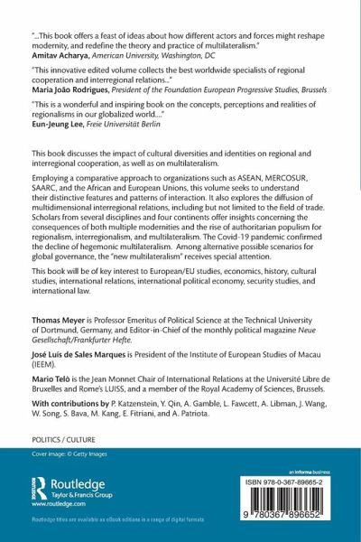 This book discusses the impact of cultural diversities and identities on regional and interregional cooperation, as well as on multilateralism. Employing a comparative approach to organizations such as ASEAN, MERCOSUR, SAARC, and the African and European Unions, this volume seeks to understand their distinctive features and patterns of interaction. It also explores the diffusion of multidimensional interregional relations, including but not limited to the field of trade. Scholars from several disciplines and four continents offer insights concerning the consequences of both multiple modernities and the rise of authoritarian populism for regionalism, interregionalism, and multilateralism. The Covid-19 pandemic confirmed the decline of hegemonic multilateralism. Among alternative possible scenarios for global governance, the "new multilateralism" receives special attention. This book will be of key interest to European/EU studies, economics, history, cultural studies, international relations, international political economy, security studies, and international law.