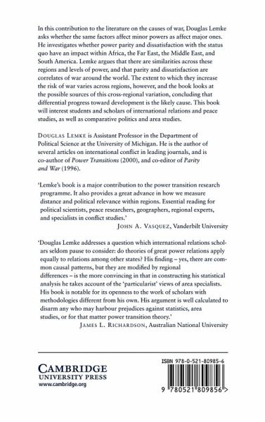 In this contribution to the literature on the causes of war, Douglas Lemke asks whether the same factors affect minor powers as affect major ones. He investigates whether power parity and dissatisfaction with the status quo have an impact within Africa, the Far East, the Middle East and South America. Lemke argues that there are similarities across these regions and levels of power, and that parity and dissatisfaction are correlates of war around the world. The extent to which they increase the risk of war varies across regions, however, and the book looks at the possible sources of this cross-regional variation, concluding that differential progress toward development is the likely cause. This book will interest students and scholars of international relations and peace studies, as well as comparative politics and area studies.