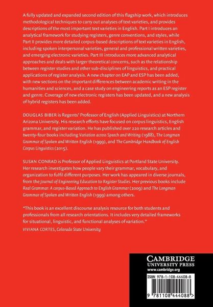 An updated new edition that provides detailed descriptions of important text varieties in English along with methodological techniques to carry out analyses of them, including conversation, newspaper writing, academic prose and social media. Each chapter ends with activities for the reader to apply and practice the analyses they read about.